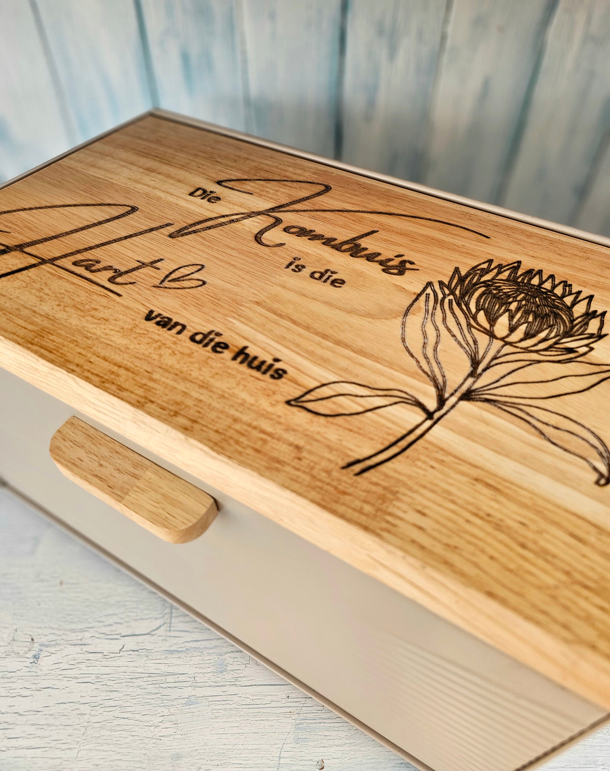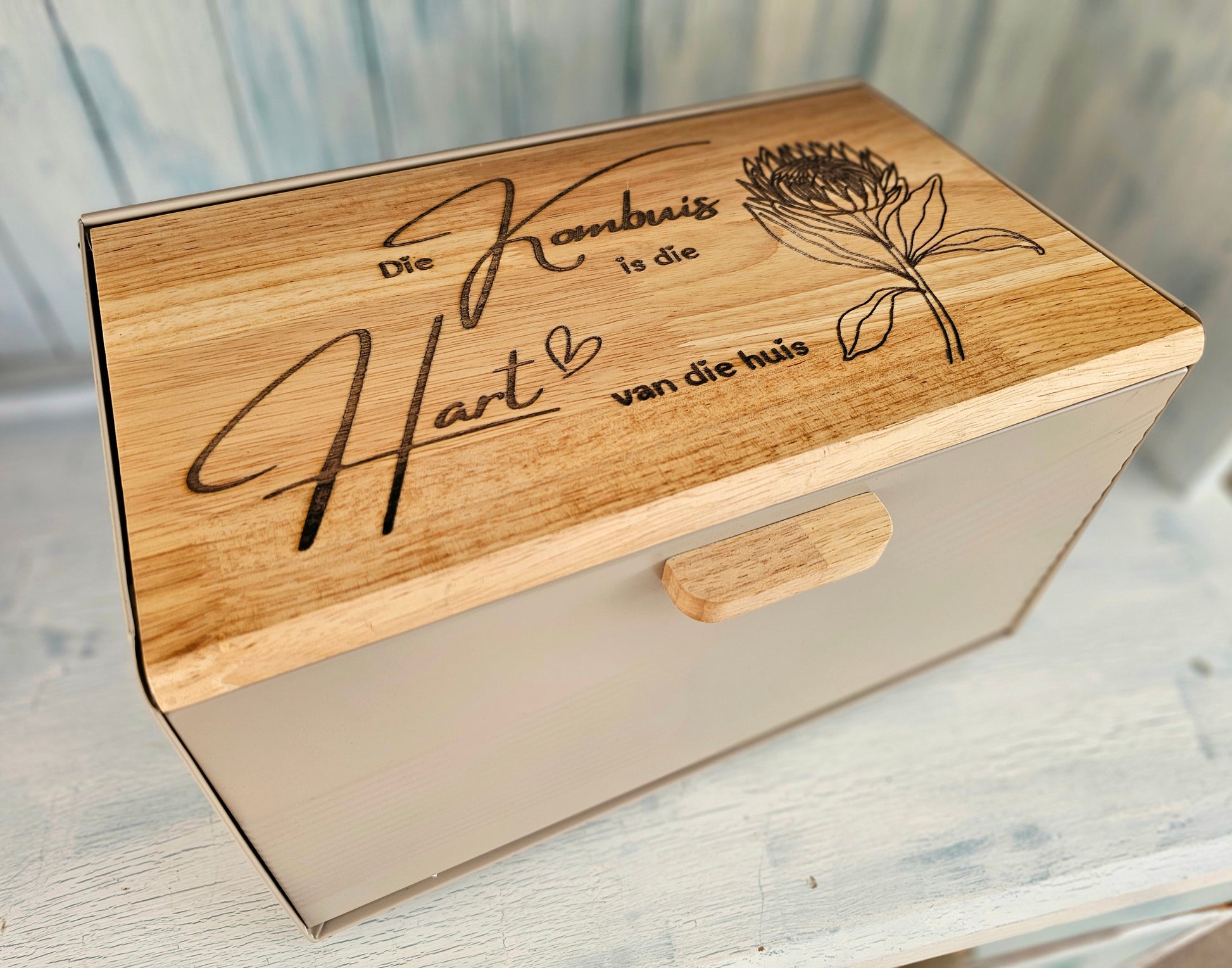 Large bread storage container made from tin and wood, engraved with "die kombuis is die hart van die huis"