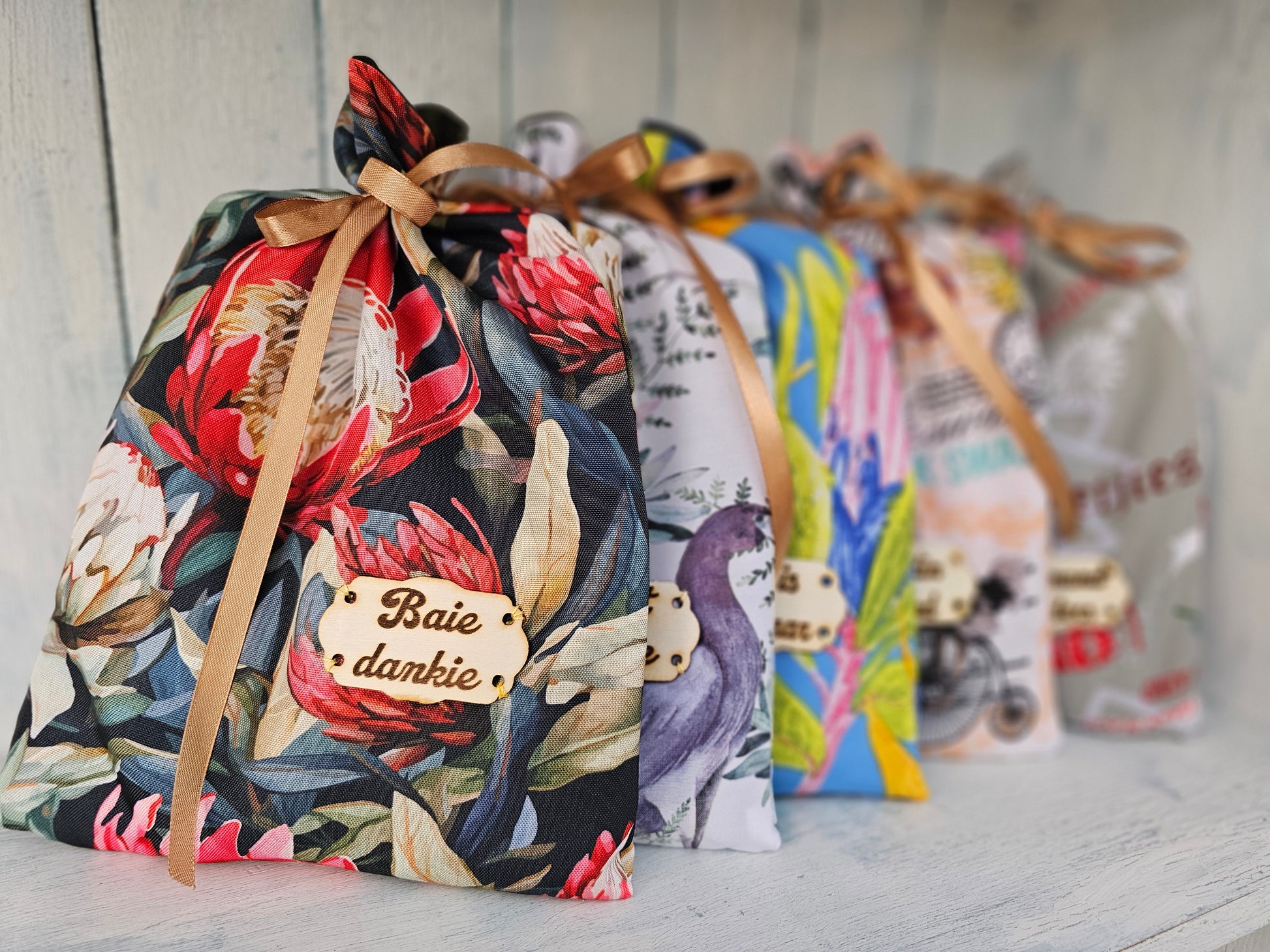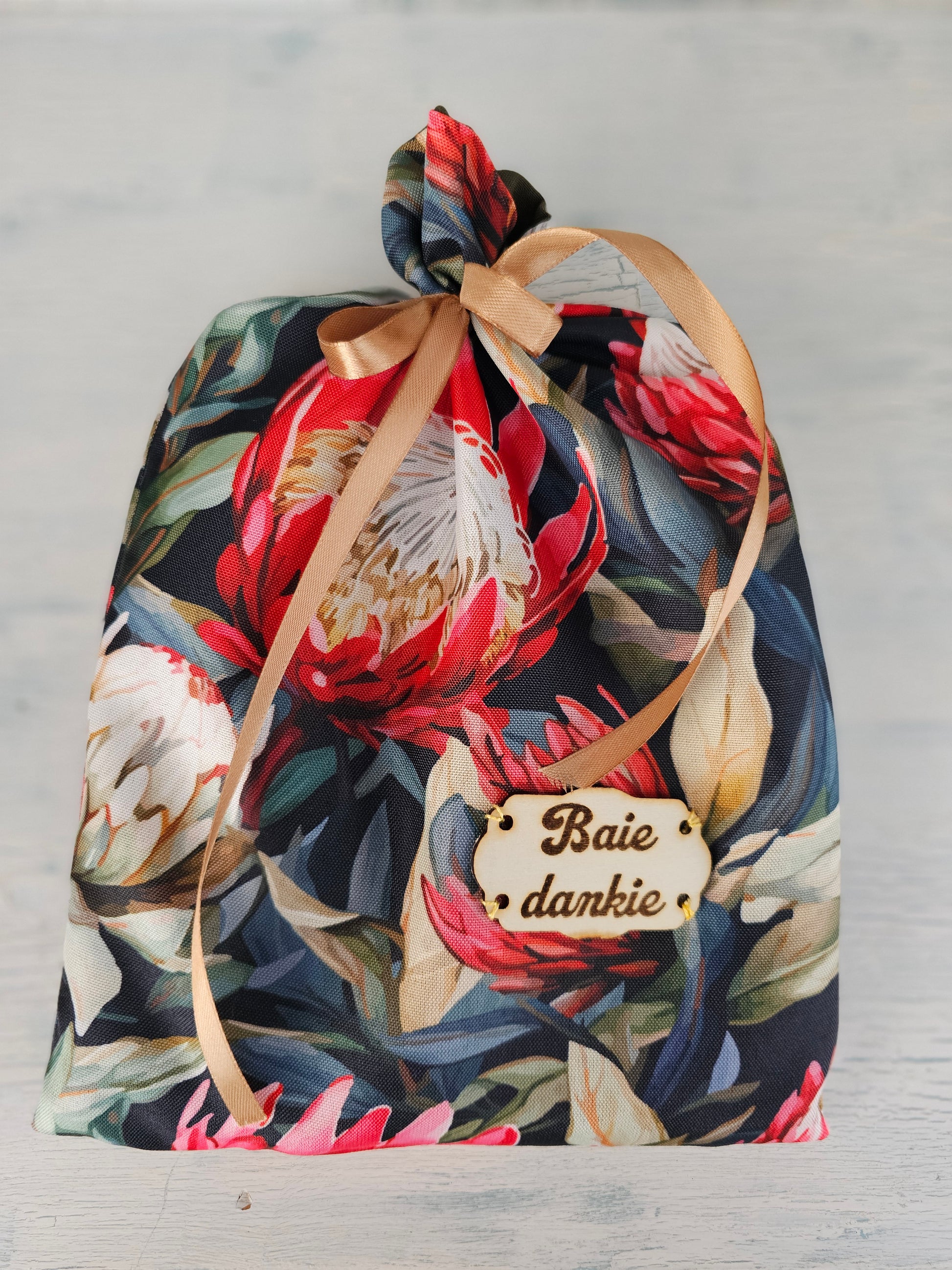 This beautifully handmade gift bag, made with Afrikaans/protea themed printed fabrics, comes with the following contents: