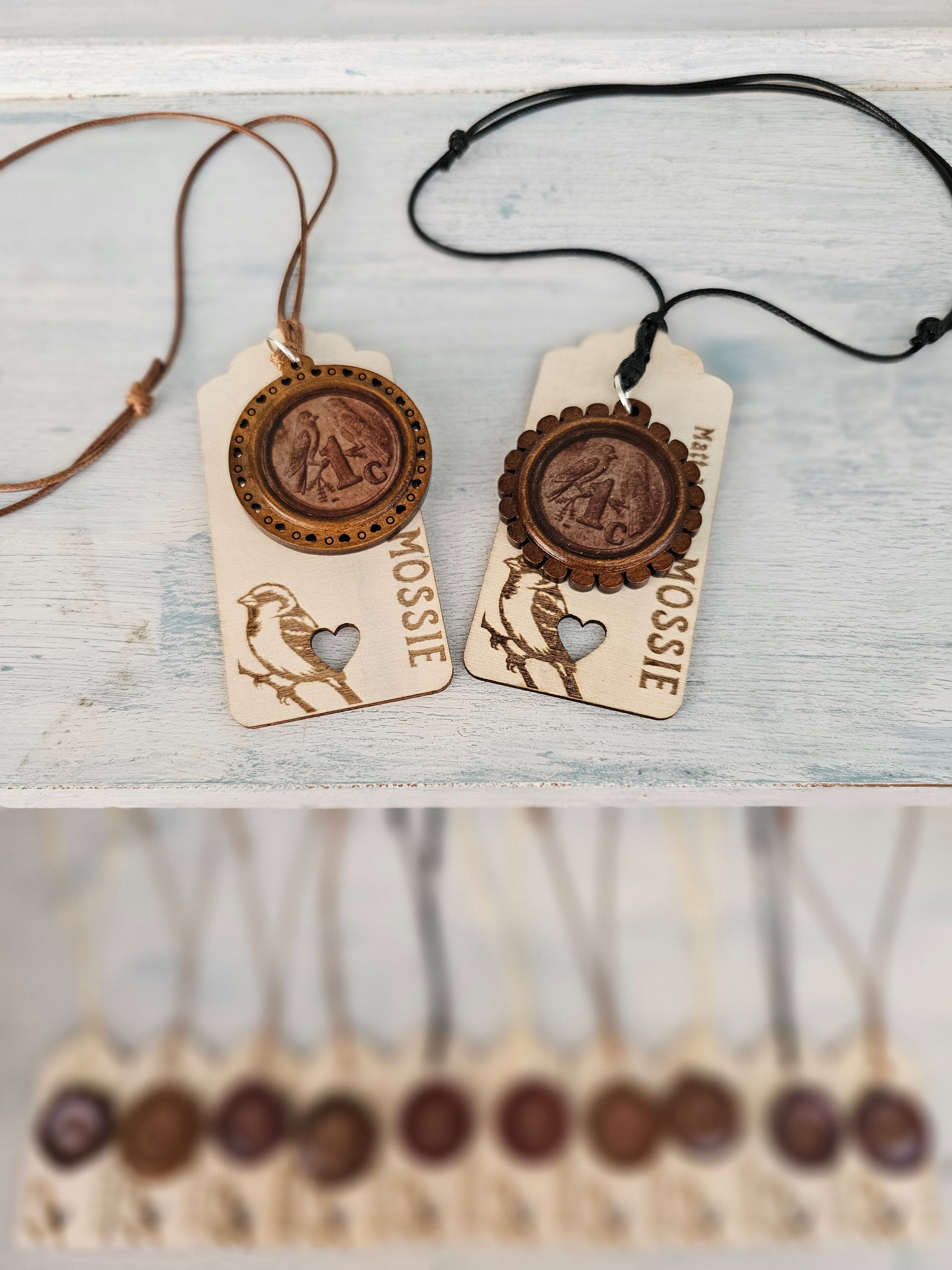 What an awesome little trinket. The pendant comes in a 1c wooden design on a beautiful engraved plate on a leather like adjustable string.